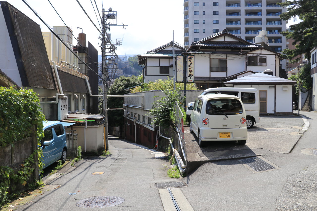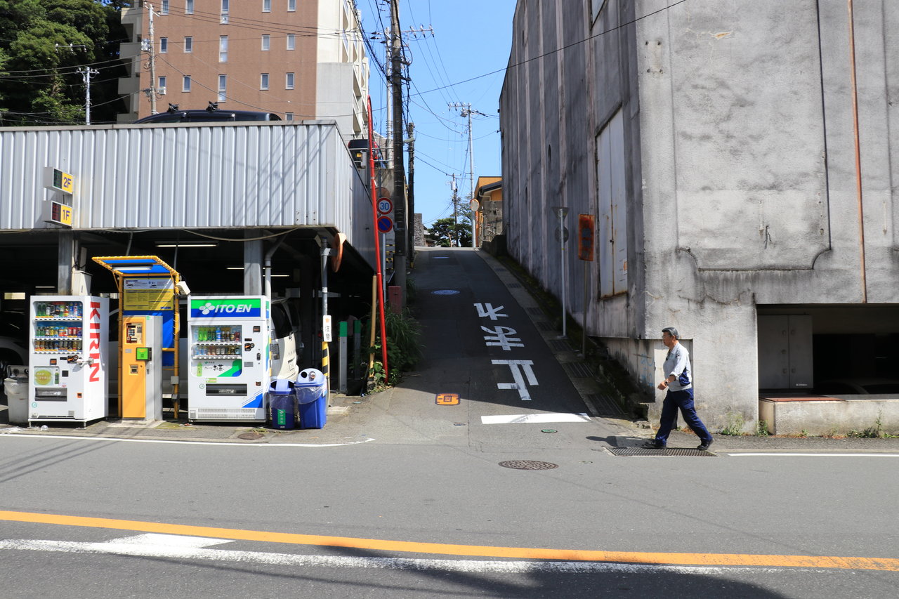 バス道路へ出て正面の道を上り下りすると海岸に出るかと思いましたが旅館があり行き止まりでした。熱海は旅館、ホテルが多くすんなり海岸へ降りられる道は少ないようです。