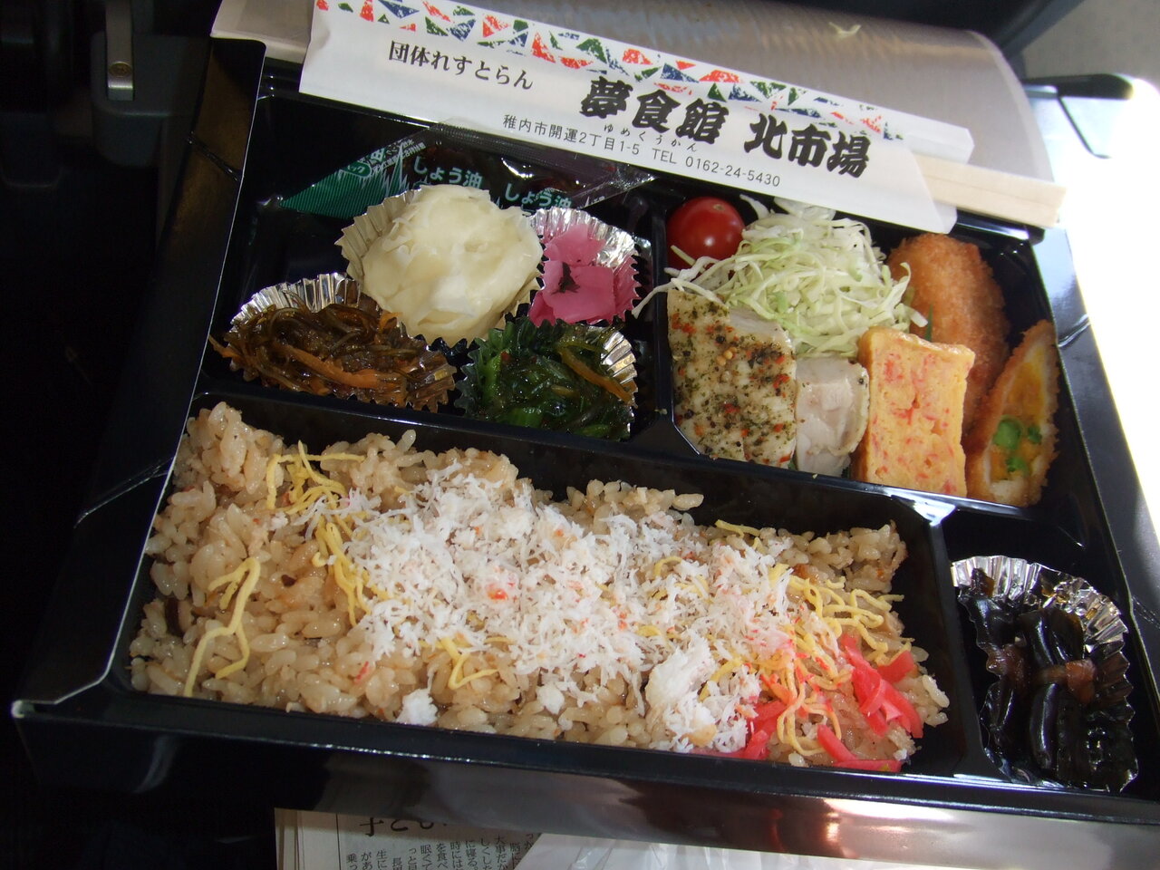 稚内空港は小さな空港なので、レストランはなく、弁当、おにぎりの類も売っていないということで注文を取ってくれたお弁当を頼みました。空港へ行く途中、往きに寄った「北市場」で受け取り12:20発の飛行機の中で食べました。