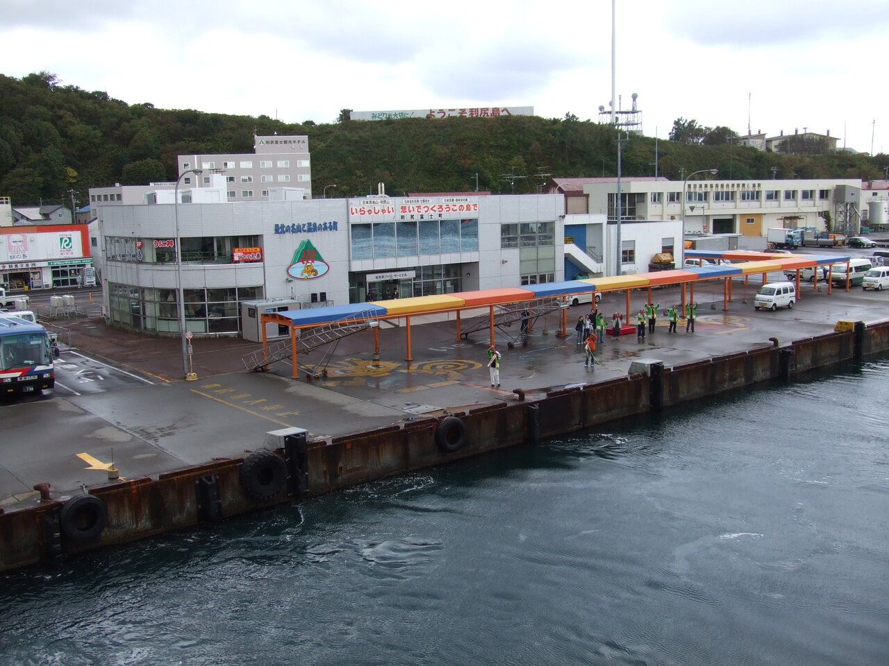 船に乗り込む時、乗船梯子のそばで襷を掛けた男性が一人、マイクを手に声を張り上げ、多くの人が紙テープを持って見送る準備をしていました。船が岸壁を離れだすと壇上でカラオケをバックに利尻の歌を歌い出し利尻のPRを始めました。何だったのだろうと帰ってからインターネットで調べると、利尻島観観光大使嶋惇一氏による歌での見送りでした。「利尻慕情」と「島を愛する」という歌で、利尻島を訪れてくれたお客への感謝と、再訪を願って毎日行われるそうです。「利尻慕情」は畠山みどりさんのレコードB 面に入っていた曲だそうです。
