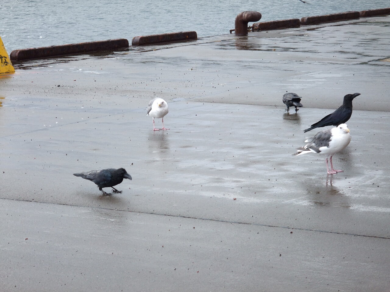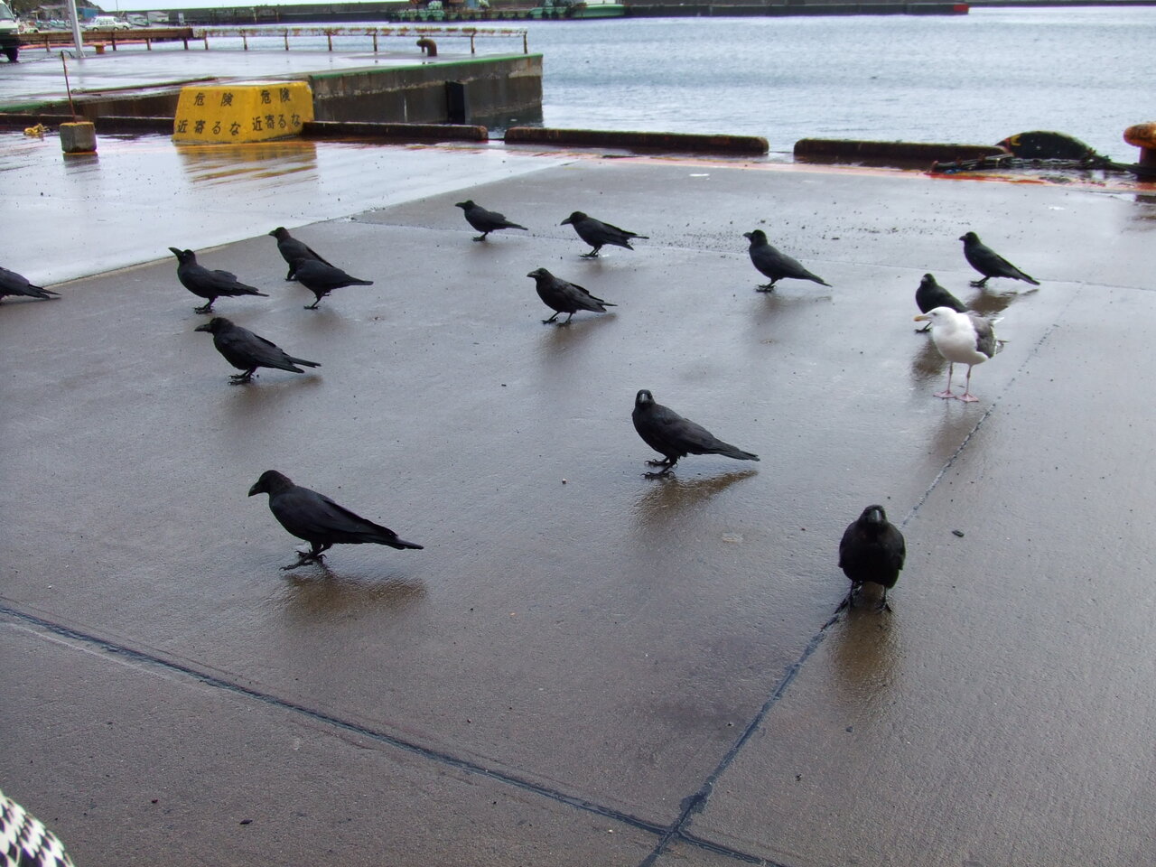 餌を与えても、おっとりしたカモメはカラスに餌を奪われ食べることができません。カラスは放り投げられた餌を空中で上手にキャッチしてしまいます。