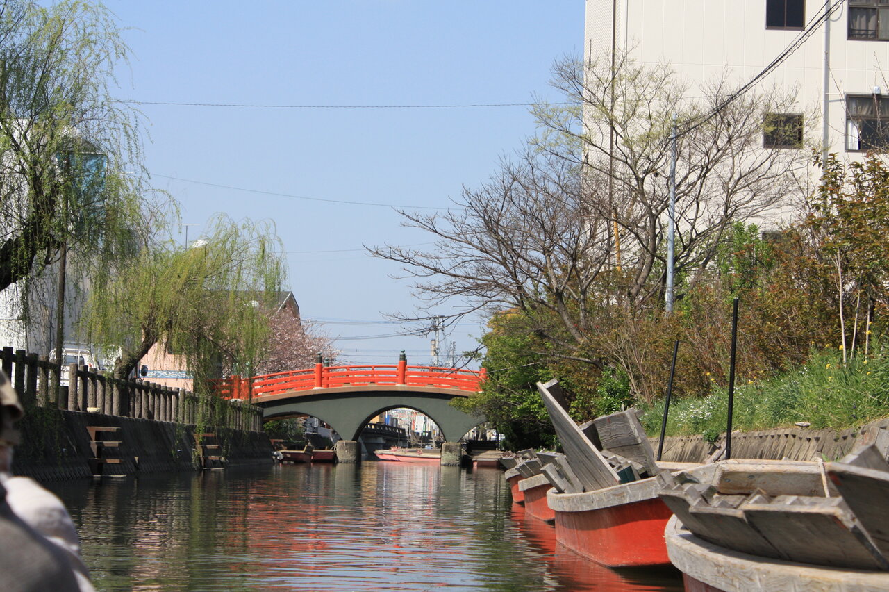 二番目にくぐった橋は朱塗りの橋でした。この辺りはまだ駅前の大通りのそばです。