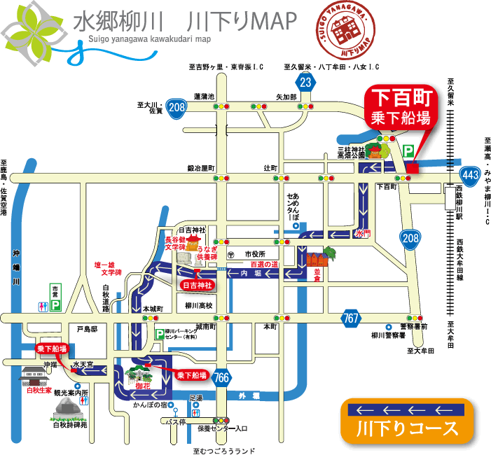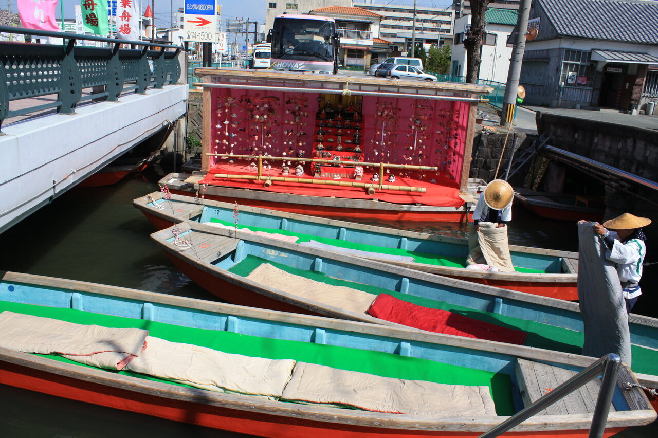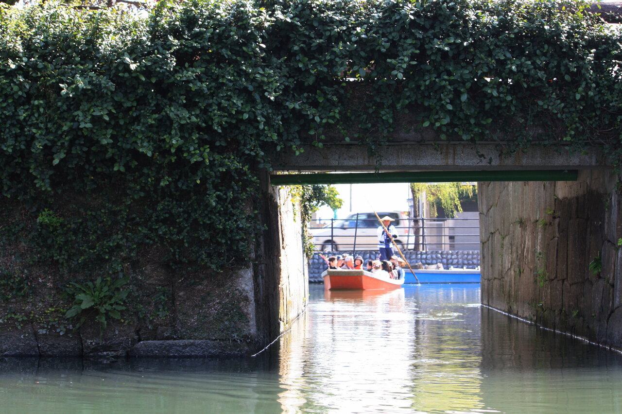 柳川駅に着くと、まず、川下りの船着き場へ向かいました。柳川城を囲む堀が現在は川となり水が静かに流れています。この堀を舟で下るのです。