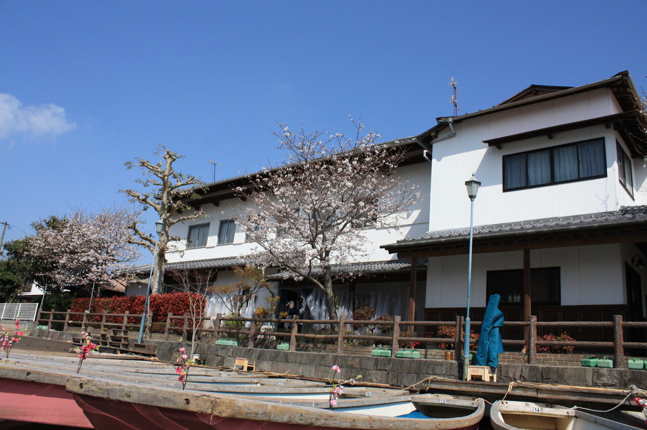 橋をくぐると旅館らしき建物が見え、船着場があり舟が並んでいました。