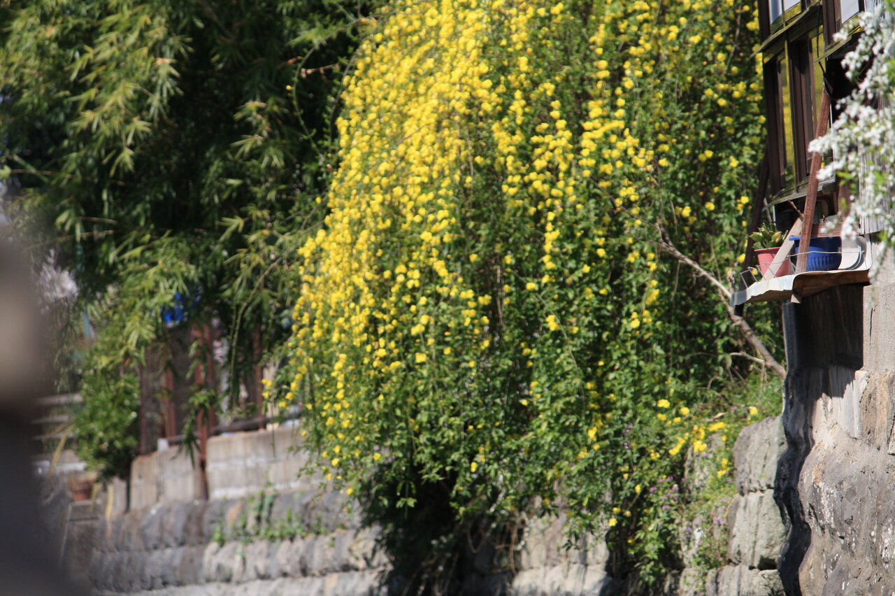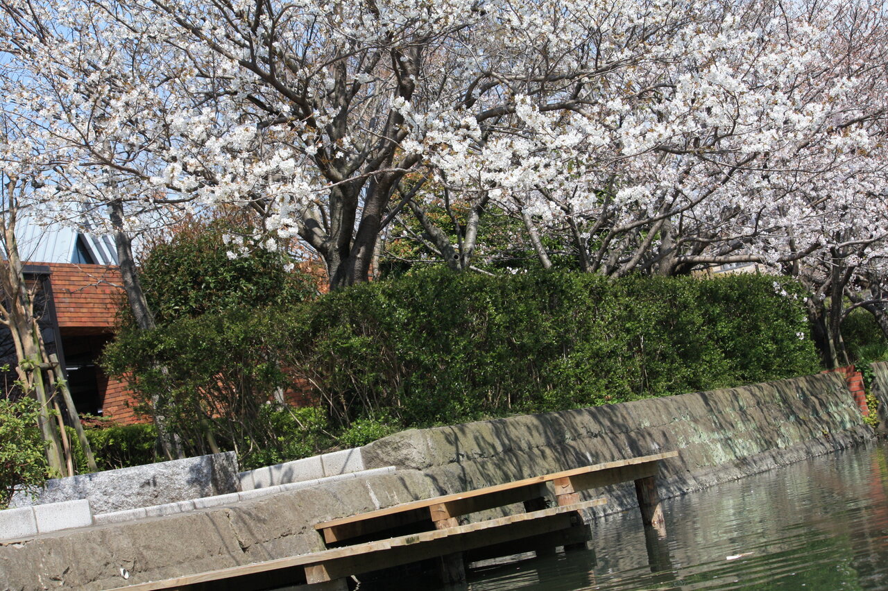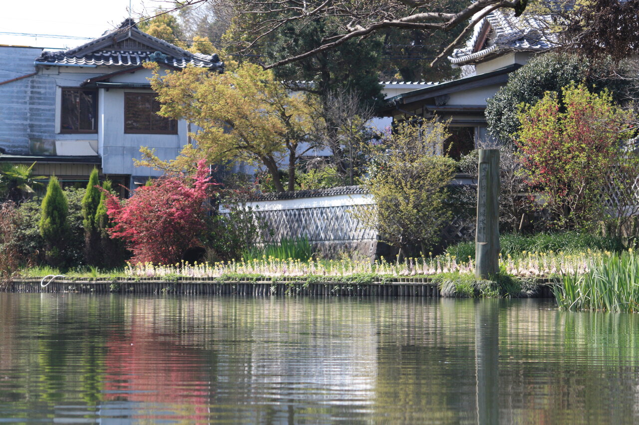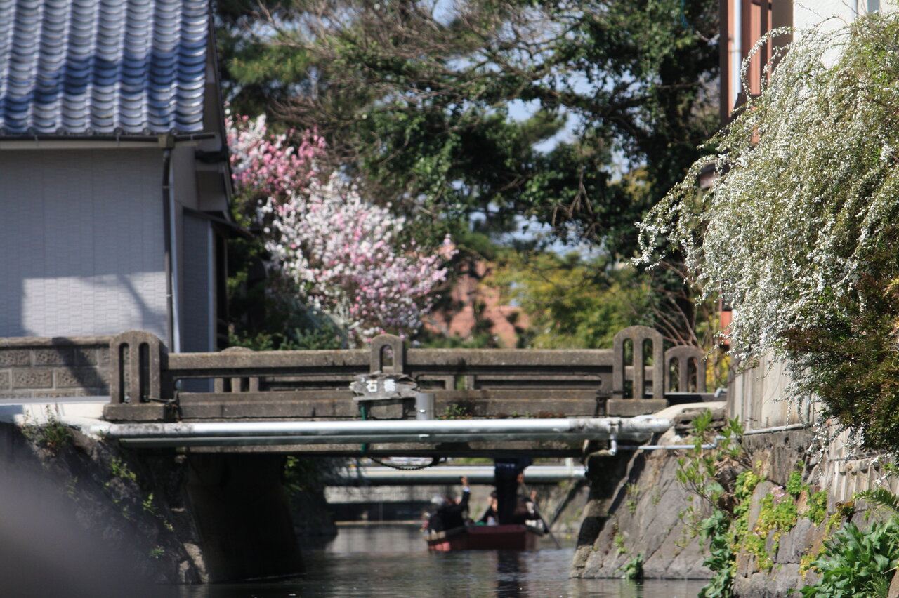 雪柳の花も見られ、相変わらず水面と橋の距離が狭いところを舟は進みました。この辺りは人家の建物が川辺りに建ち、川に垂れ下が庭の花を見ながら進みました。