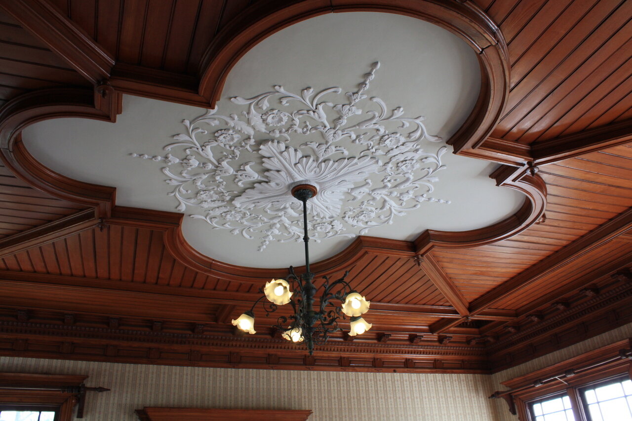 洋館の天井の木組みと白いデザインが素敵でした。