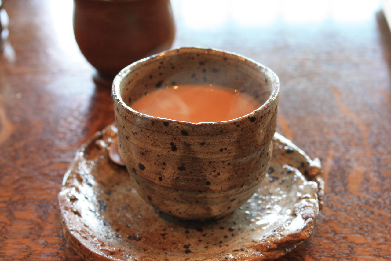 部屋も渋いですがコーヒーカップも渋い陶器のものです。カップの取っ手はついていません。手作り感のあるコーヒーカップとお皿でした。