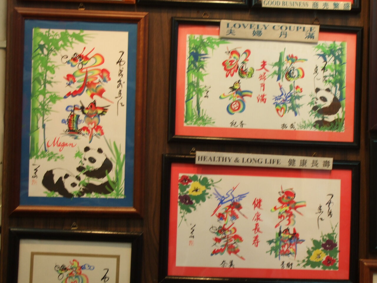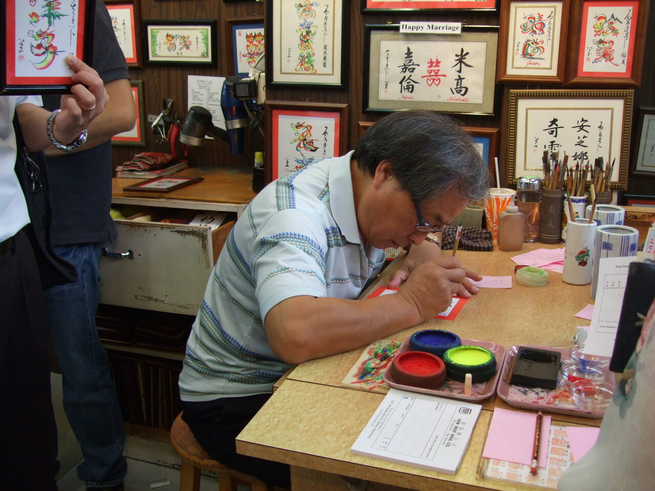 「先生」と呼ばれる人に自分の名前を書いて渡すと風水の意味を込めて写真のような絵文字を書いてくれます。そういえば、ホテルの前の通りに「・・先生」と書いた張り紙が沢山あり、「家庭教師の先生をします」の意味かと思っていましたが、「先生」の意味がわかりました。人気がある先生とそうでない先生がいるようです。観光客相手が多いらしくツアーと提携している店が混んでいるようでした。
