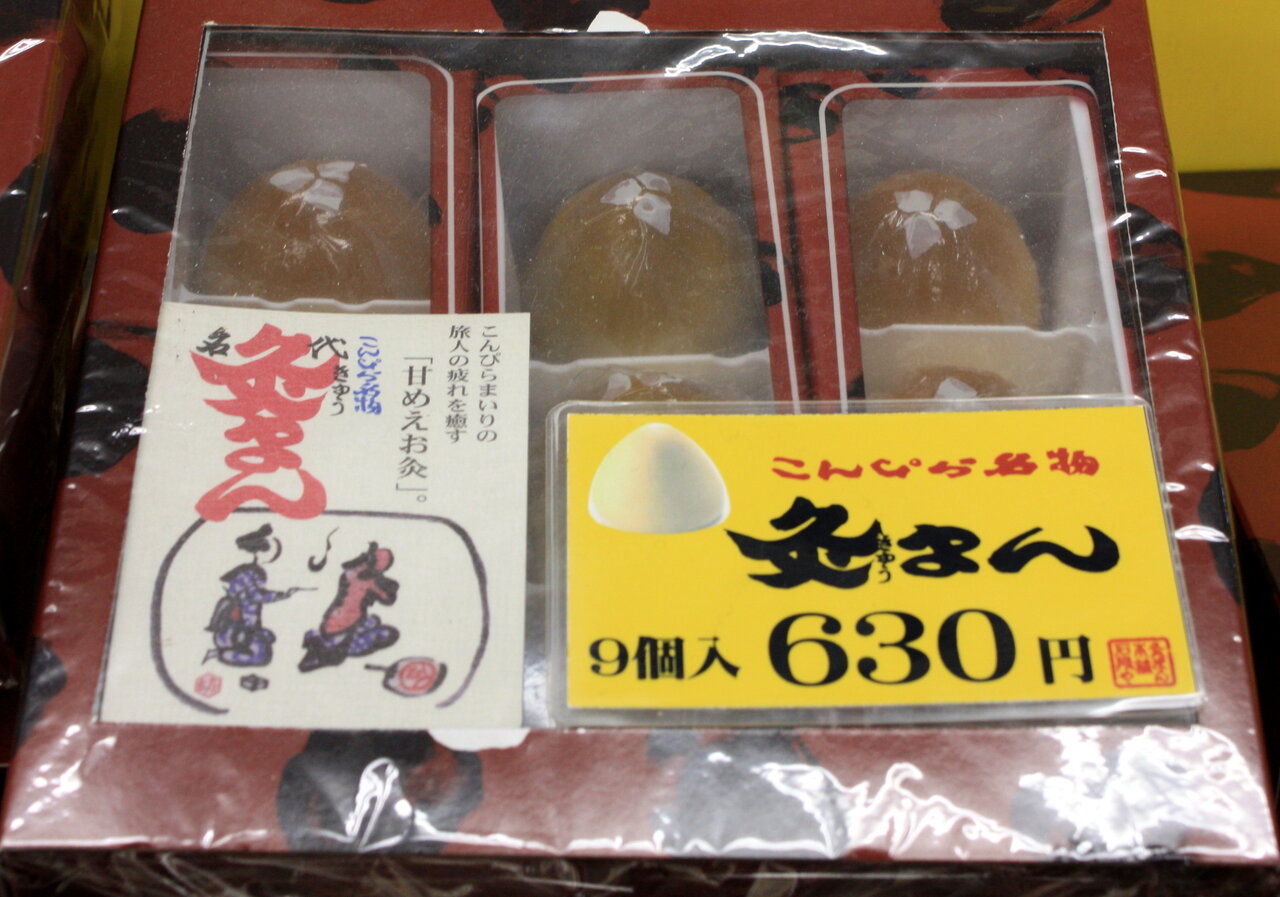 金比羅宮参道に本店がある昭和23年創業の「灸まん本舗石段や」がつくったお灸の形をした饅頭「灸まん」は金比羅宮のお土産として親しまれているとのことです。