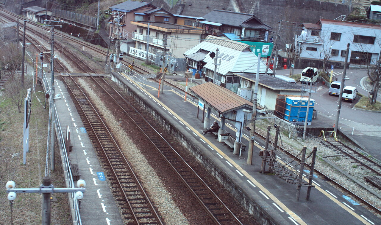 「大歩危駅」のホームには列車待ちの人が一人いるだけでした。ホームに吊り橋「かずら橋」のミニチュアが置かれていました。