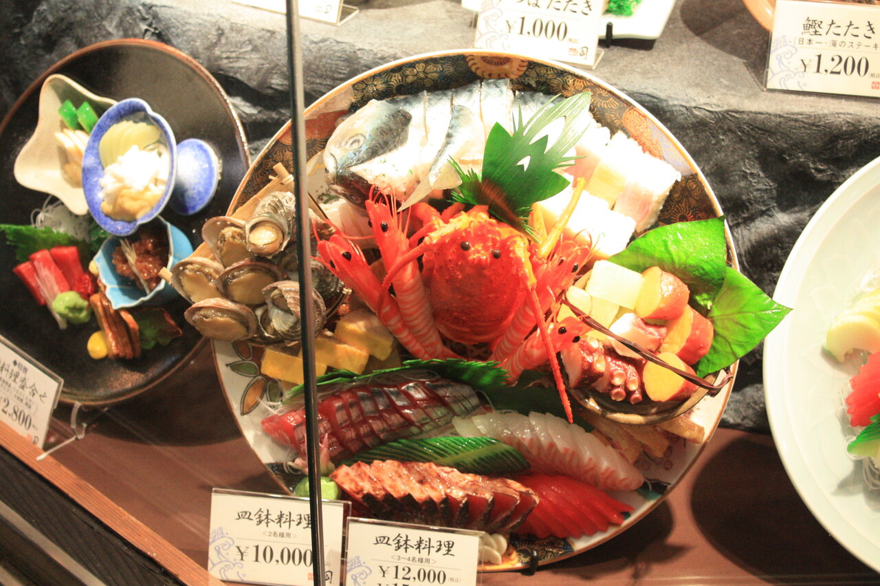 アーケード街に入りすぐ右に曲がった所に郷土料理の店がたくさんありました。どの店もメニューが同じで、必ず「カツオのたたき」がついていました。