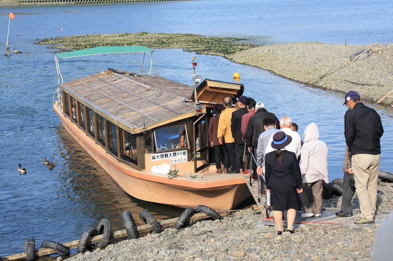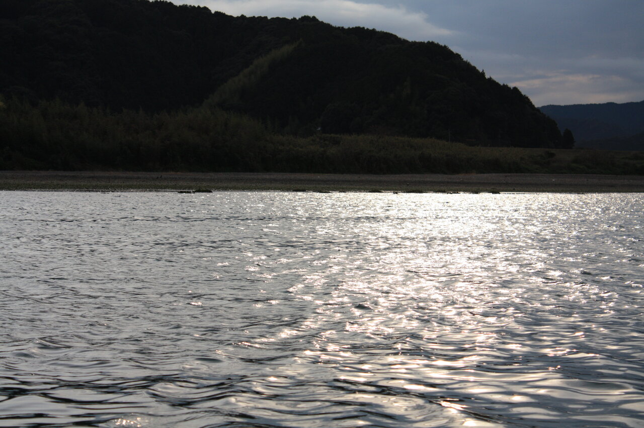 川べりの石がわずかに緑懸かっているのは石にこびりついている「青のり」です。河口から9 kmにわたり海水と淡水が混ざり合っている場所(汽水域)なので「青のり」が採れるのです。天然青のりは国内生産の90%をしめているそうです。