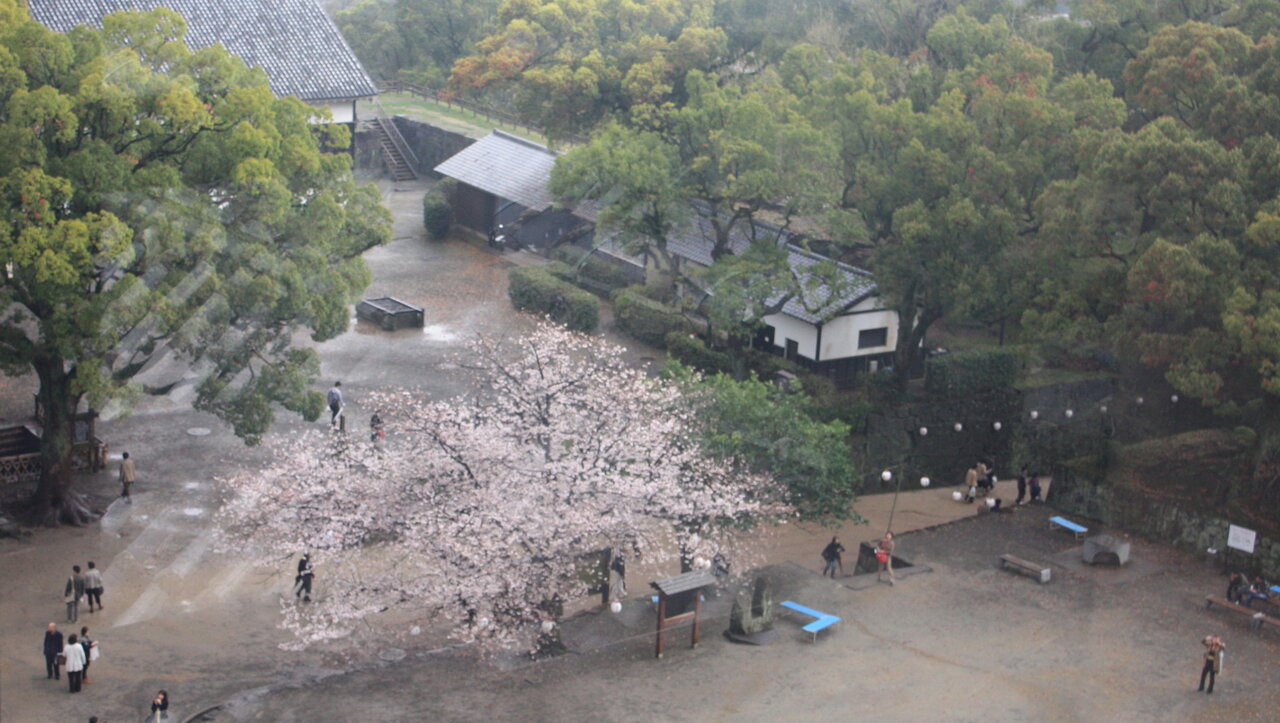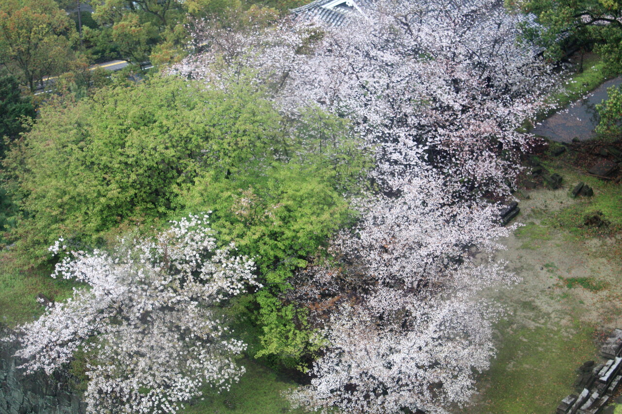 熊本城天守閣の上から桜を見ました。