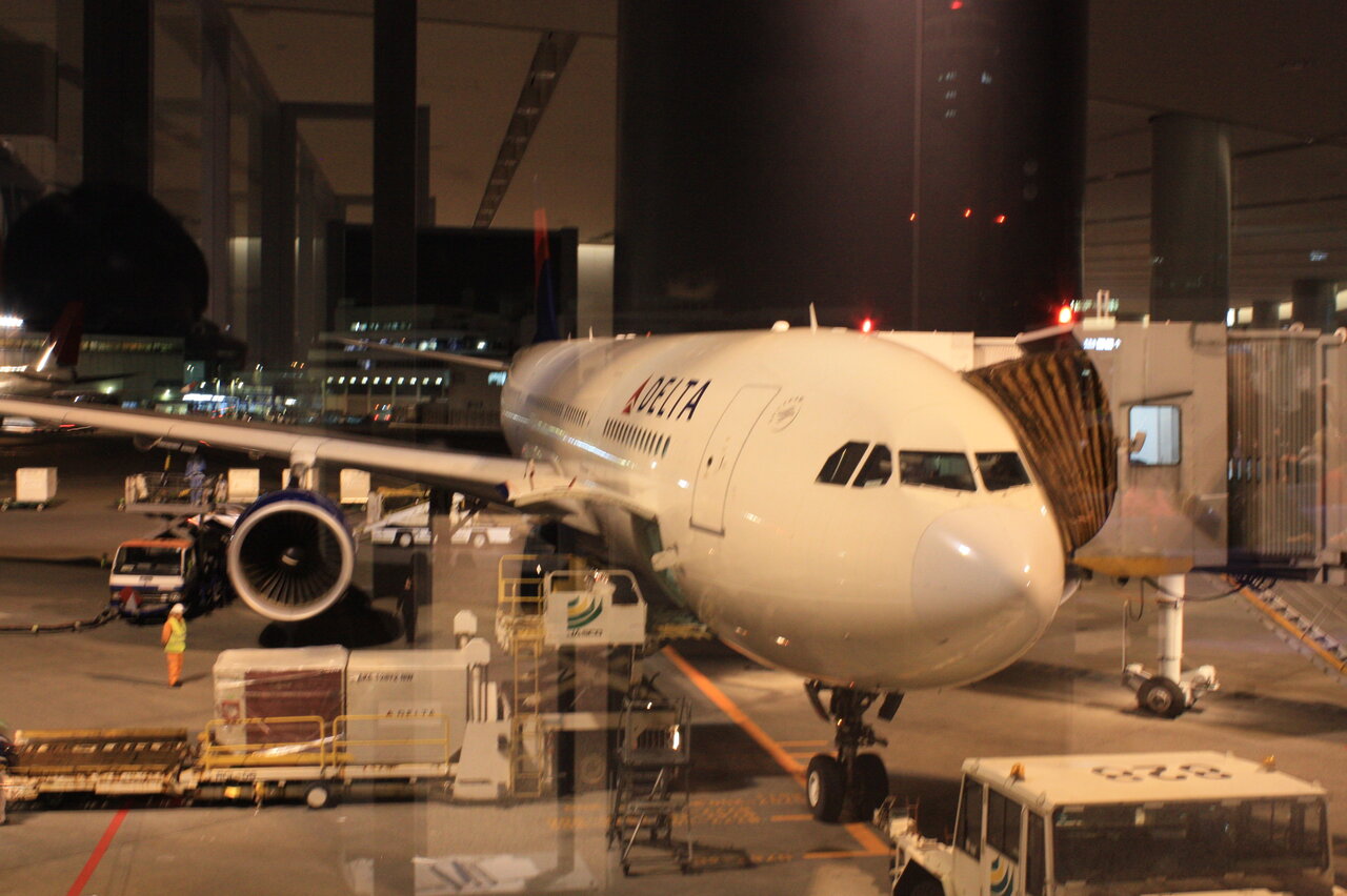 デルタ航空なのでデトロイトから飛んできた自社の飛行機を待ったのでしょう。飛行機が動いたものの今度は「本日強風のため、現在、滑走路は一本しか使えたないため順番を待っております」のアナウンスで結局、一時間半遅れで飛び立ちました。前翼の前の席に座れ、夜景を見ながら東海地方、四国、九州へと海岸線上を飛び、九州から南に下るルートでした。運よく山側の席だったので日本の海岸線がよく見えました。