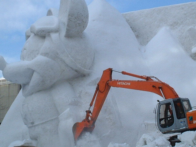 ショベルカーで少しずつ雪の像を壊し、その壊した雪を固めて上に上がり上部を解体して行きました。