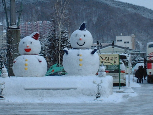 ホテル前に大きな雪だるまがありました。夫婦と子ども二人の家族でした。