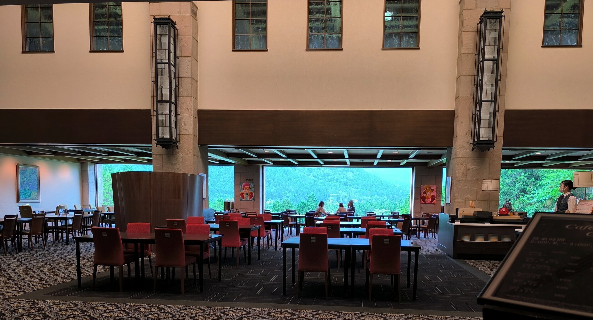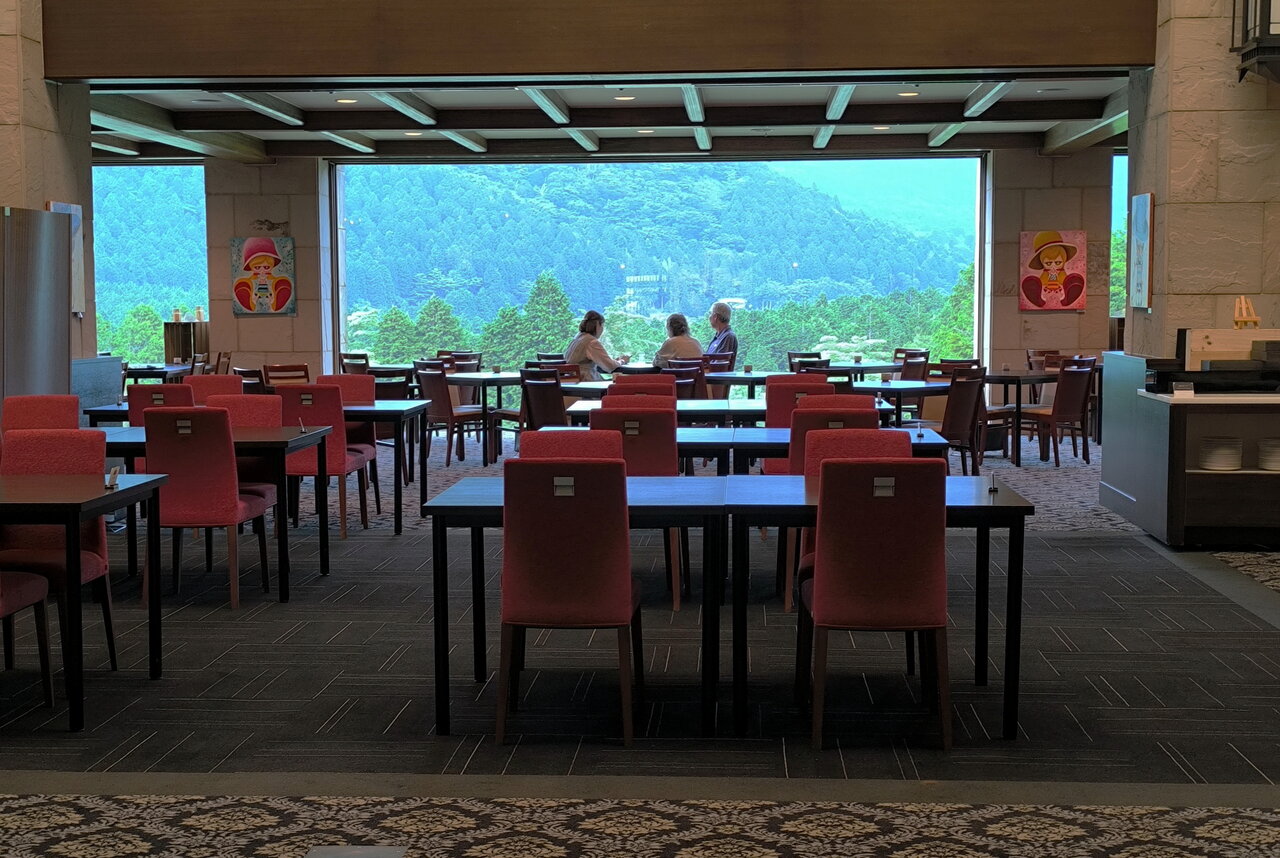 入口を入ると正面の大きな窓に箱根外輪山が見えました。