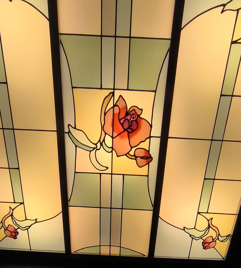 5階(最上階)へのエレベーターの中の天井のステンドグラスです。